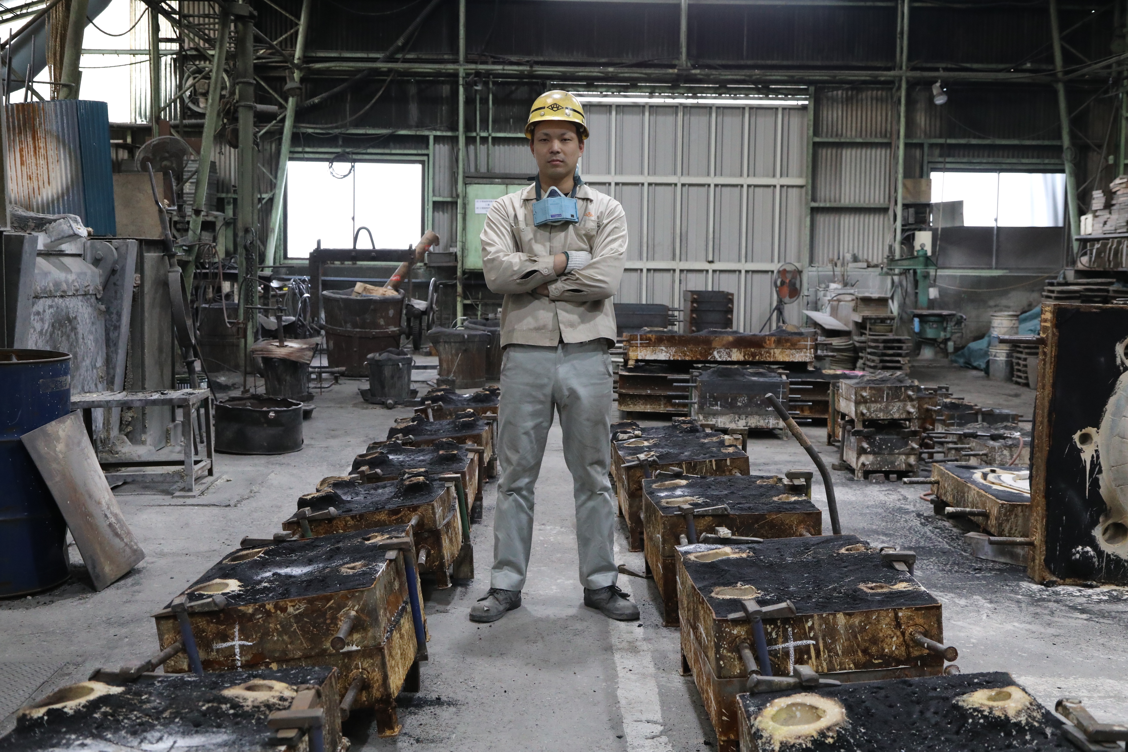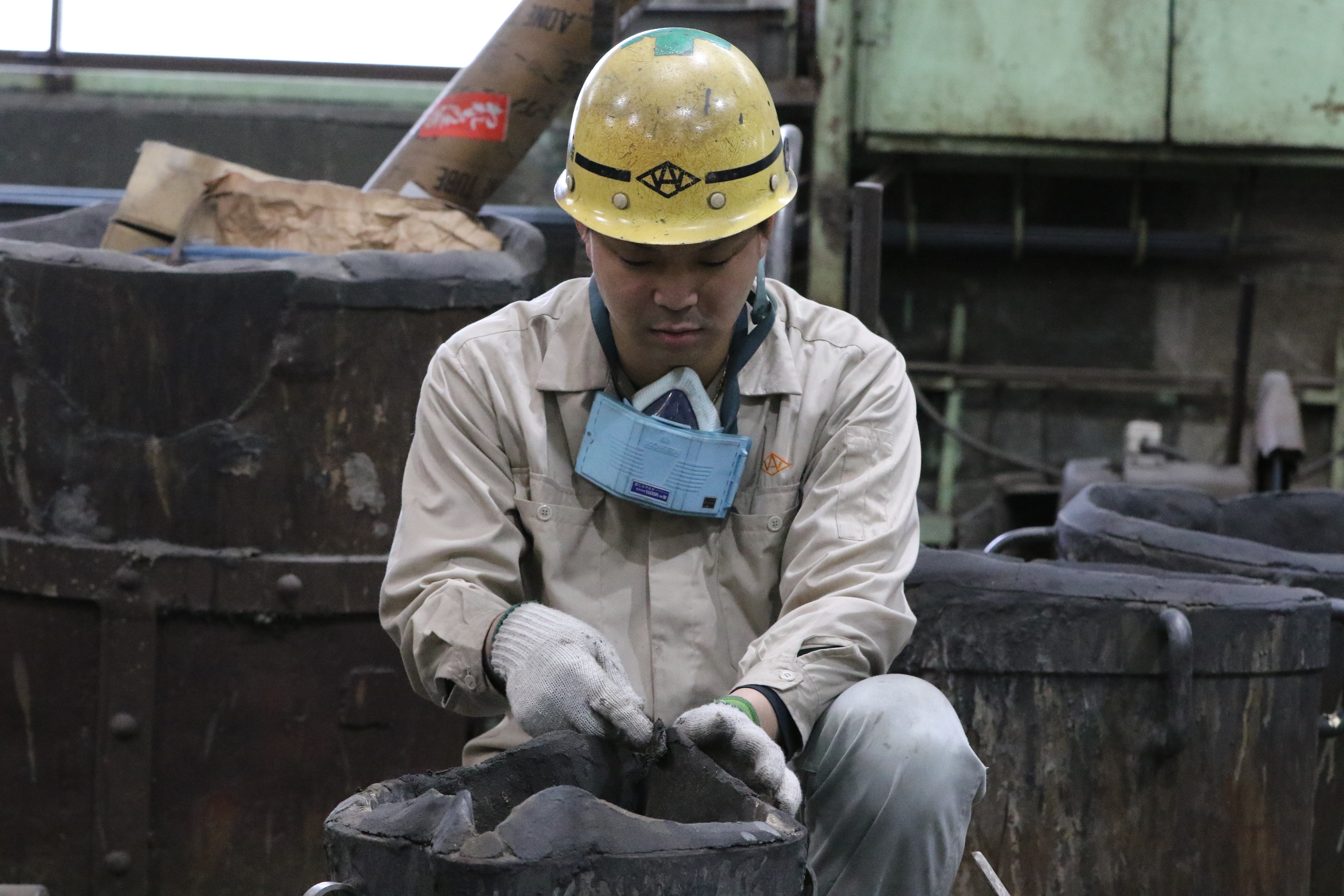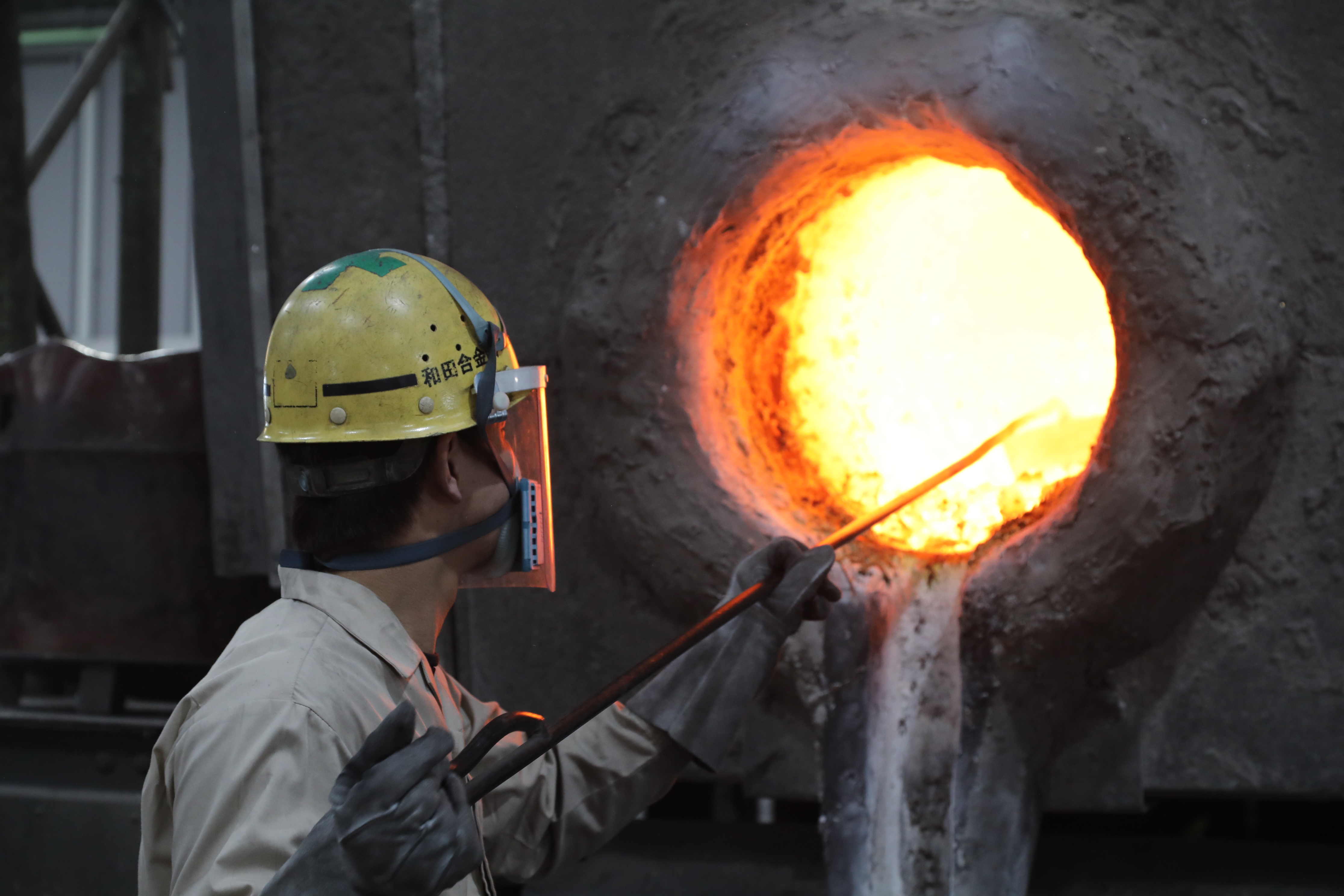 2017年3月31日 現在1946年の創業以来、製鉄所の圧延ライン向けの軸受や船舶用ディーゼルエンジン内の部品など、銅合金部品の鋳造から加工までを一貫生産する和田合金株式会社。金属溶解作業の責任者として電気炉とガス炉を操るのは、入社6年目の山田さんだ。2時間半かけて溶かした銅合金を、約1200℃で出湯。この時の温度管理と脱酸・脱ガス処理が品質を左右する。「微調整や見極めは、自分にしかできない仕事。プレッシャーはあるけど、その分やりがいもあります」と語る横顔は頼もしい。今後は器用さを活かし、他の行程もできるオールラウンダーになることが目標だ。休日は同僚と朝6時半からソフトボール。2歳になった子どもと、キャッチボールができる日を楽しみにしている。