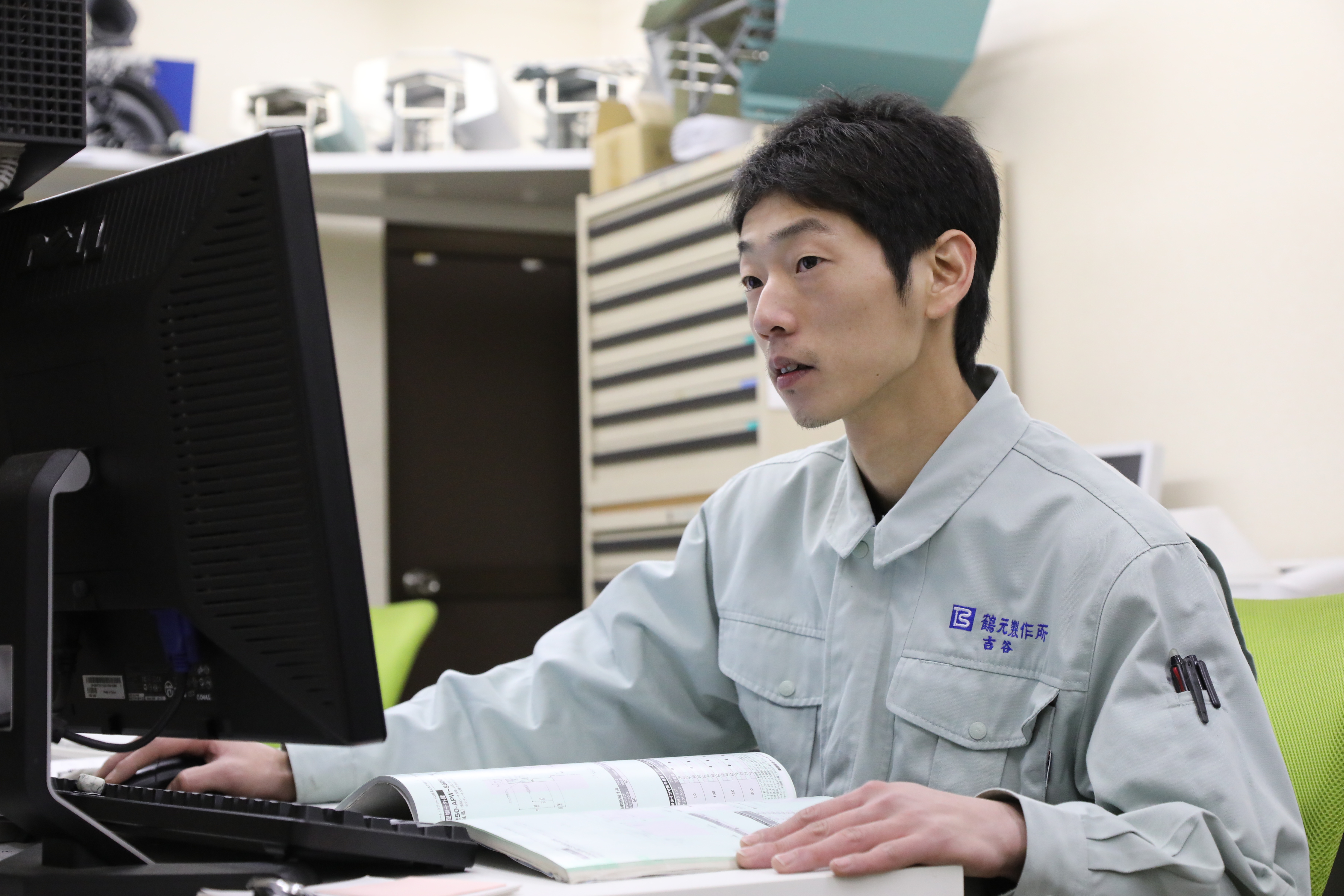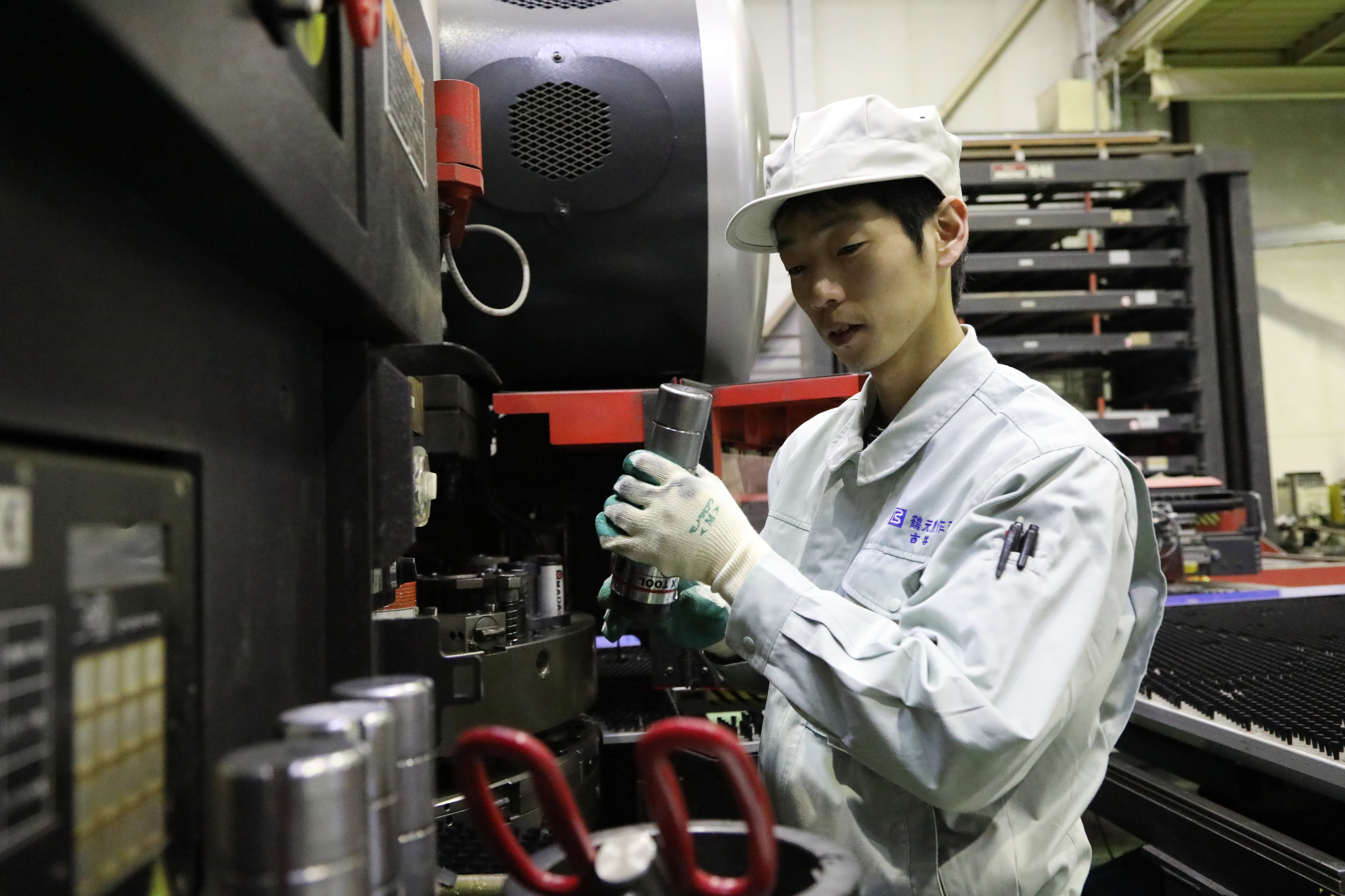 2017年3月31日 現在大規模工場などの換気・排煙・採光装置、ならびに各種建築金物を設計製作し、OEMメーカーとして国内有数のシェアを誇る株式会社鶴元製作所。ここで板金加工機械による切断、曲げなどの作業をしながら、設計プログラムを勉強中の吉谷さんは、入社5年目。入社2年弱で挑んだ図面の試験で、みごと九州2位に。その後もこつこつと努力を続け、現在は会社から期待される若手の筆頭だ。幼い頃からプラモデルなど、物作りが好きだったことから、大学は機械工学科に入学。入社後は「学ぶことがたくさんある」と目を輝かせながら、幹部候補生として日々成長中だ。趣味は、大学時代から始めたインディアカ。仲間たちと週3~4日のペースで練習に励み、週末は試合に参戦。仕事同様熱く打ち込み、こちらでも常に上位成績を収める強豪選手だ。
