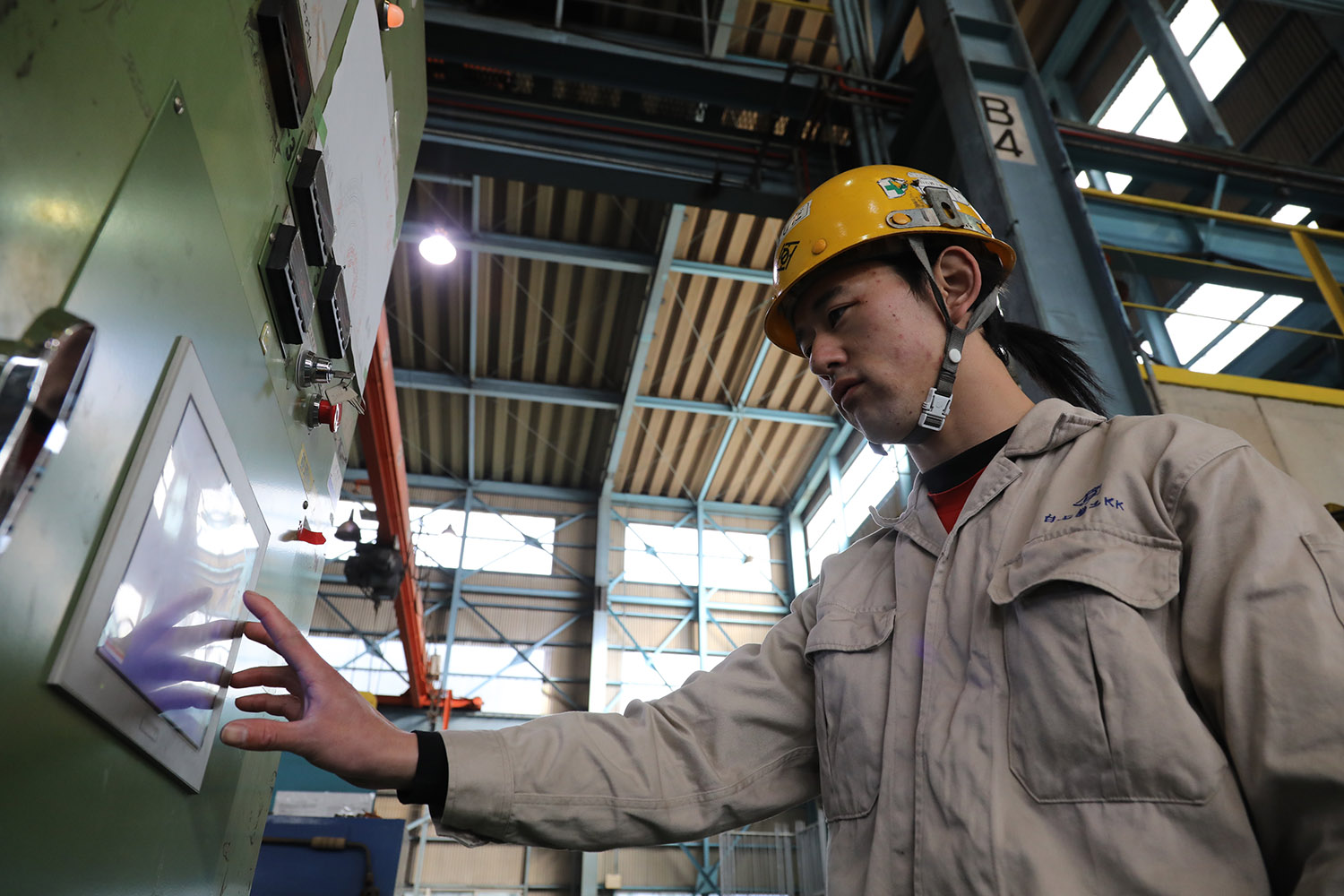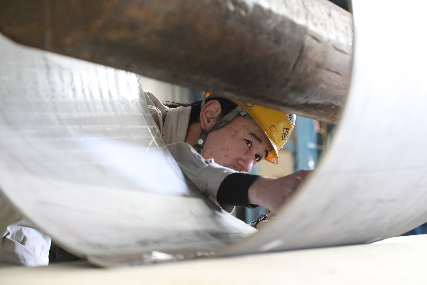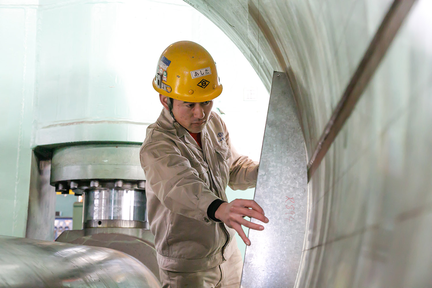 2018年3月20日 現在独自の曲げ加工技術で、エネルギー貯蔵設備である球形タンクやLNGタンク、各種圧力容器などの製作・据付工事を行う白石鉄工株式会社。鋼板を曲げる加工グループ内では最年少ながら、几帳面な性格で精度の高い仕事が評価されている芦田さん。工業高校の電子機械科を卒業後、新卒で入社した動機は「プラモデル作りが趣味なので、ここなら大きなものづくりができると思ったから」。以来10年間、曲げ加工一筋でセンスと腕を磨き続けている。「曲がったり膨らんだり、鋼板の形状が変わっていく過程が面白くて。精度±2ミリ以内の曲げ加工ができたときはとても嬉しいです」と大好きな“ものづくり”を仕事でも満喫している。オフは週に2回の筋トレに加え、休日はランニングやロードバイクを楽しむなど、アクティブに体作りを実践中。