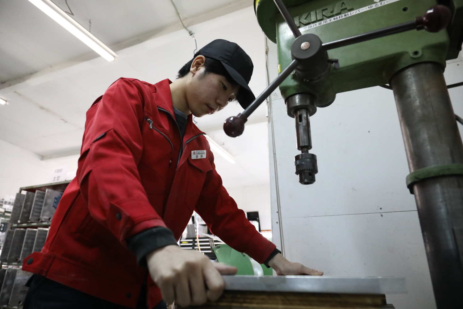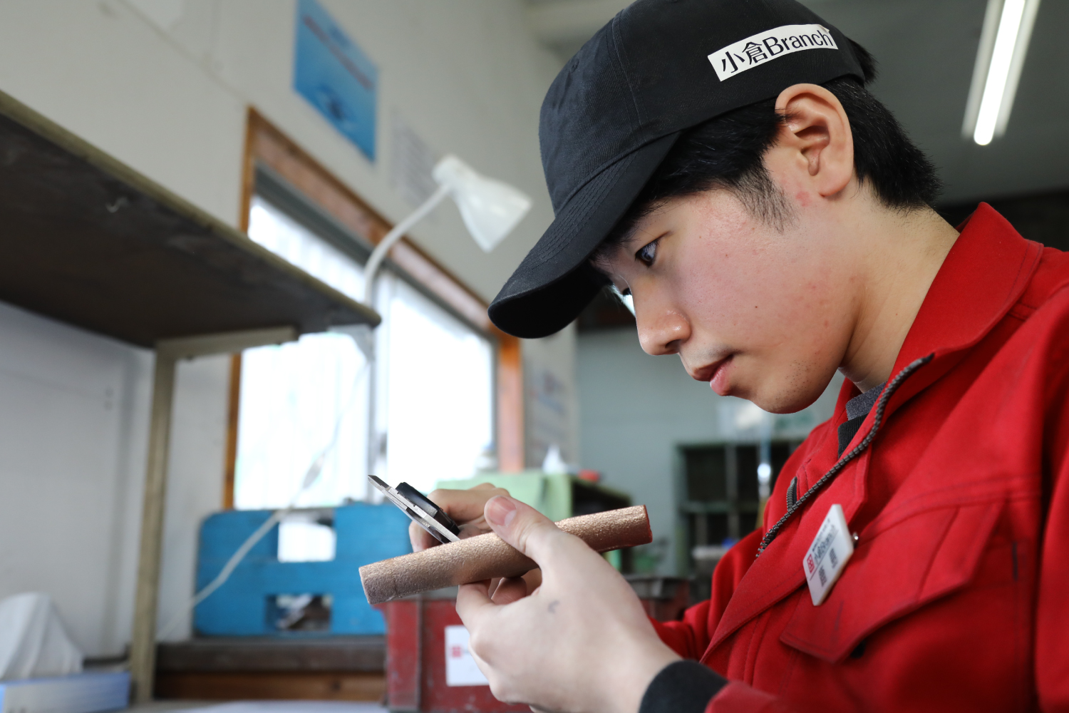 2019年3月29日 現在給水栓、管継手および付属品の設計・製造を行う株式会社カクダイ岐阜工場小倉Branch。砂型に溶かした銅合金を注ぎ、水栓金具を鋳造する工程で、入社6年目の鹿島さんは砂型に必要な主型(おもがた)を製作。銅合金が流れる道を配置、調節することで不良品の削減にもつながり、コスト低減にもつながる非常に重要な役回りだ。「樹脂を塗ったり削ったり、0.1mmを調整する緻密な作業ですが、自分で考え、工夫したことが結果につながる点にやりがいを感じます」。工業高校を卒業後、点検や保全関係の会社に就職したが、やりがいを感じることができず1年で同社に転職した。「試作の回数を減らし、すぐに量産できる主型を作れるようになりたい」と語る横顔は、今の仕事が充実していることを物語る。休日はアニメ「キャプテン翼」を見てリフレッシュ。
