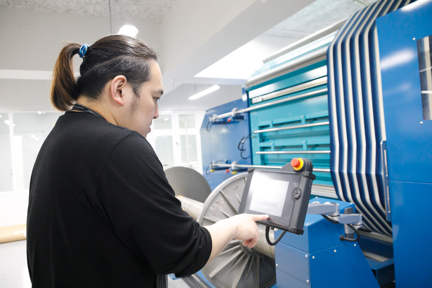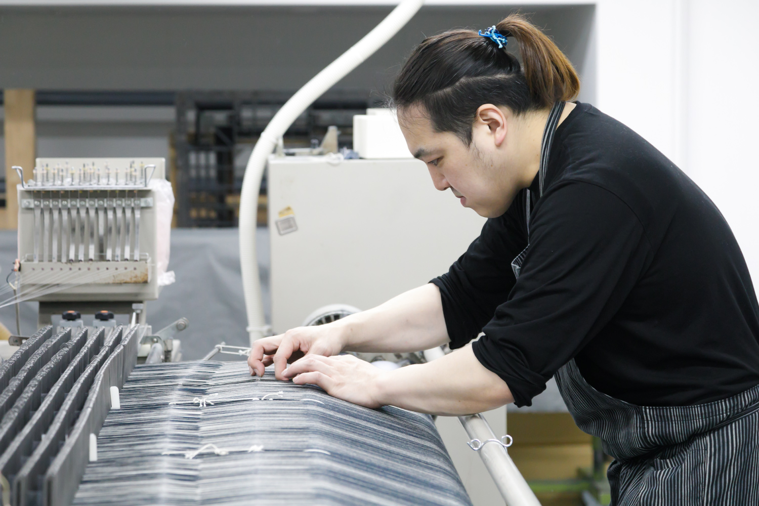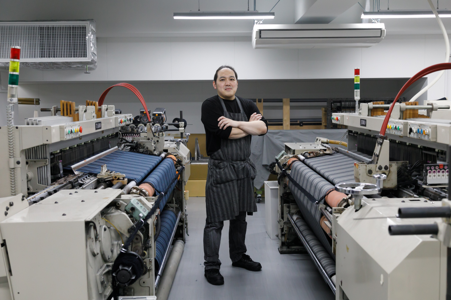 2020年2月7日 現在伝統工芸「小倉織(こくらおり)」を中心に、各種繊維生地の製造・販売・企画などを行う小倉織物製造株式会社。2018年の新工場設立時に入社した内山さんは、染織家の活動と並行して製織・整経・デザイン・糸・生地のチェックや組織計算などを担当している。「高校の頃、本で知った染織家の仕事に興味を持ち、京都の大学校で技術を習得。帰郷後は染織家・築城則子氏の下で小倉織を学びました。現在は独立していますが、その縁で機械織りにも関わっています」。高密度で難易度の高い手織りの表現を、いかに反映できるかが機械織りの肝だが「内山さんの染織家としての技術と経験が欠かせない」と社内の信頼は厚い。今後は築城氏が中心で行うデザインや生地開発を任されることが目標だ。趣味はバスケットボール。週に1~2回のペースで仲間と汗を流している。