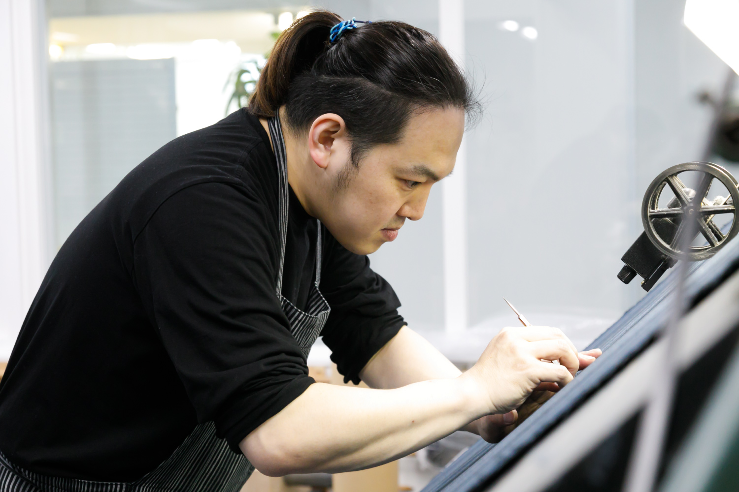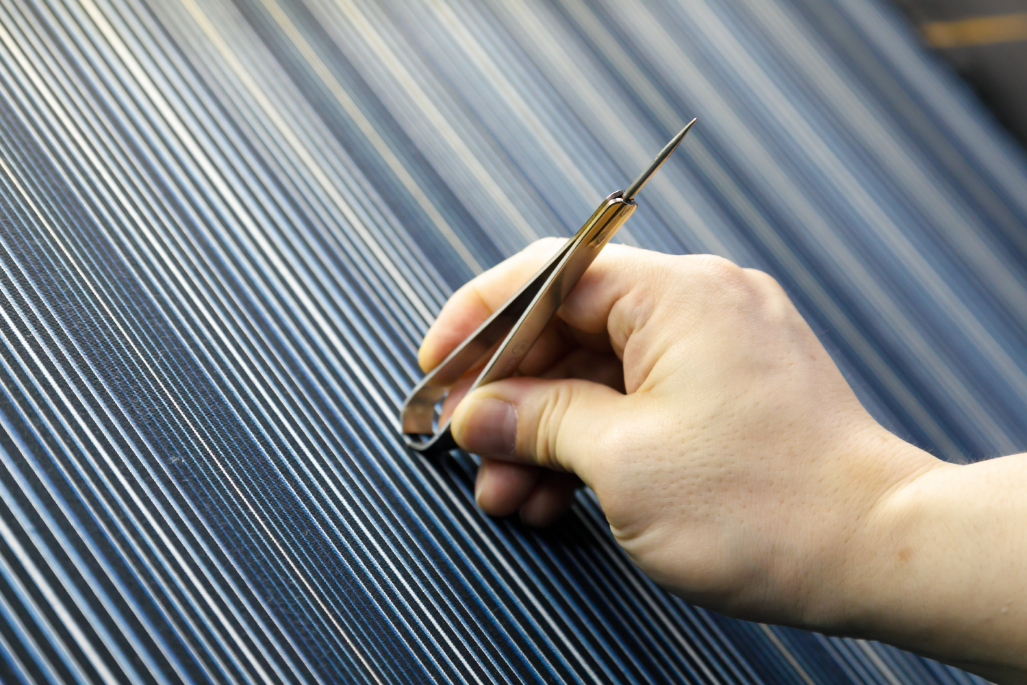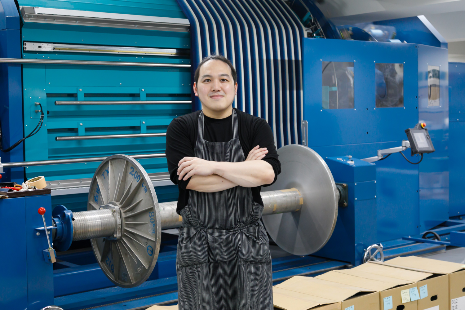 2020年2月7日 現在伝統工芸「小倉織(こくらおり)」を中心に、各種繊維生地の製造・販売・企画などを行う小倉織物製造株式会社。2018年の新工場設立時に入社した内山さんは、染織家の活動と並行して製織・整経・デザイン・糸・生地のチェックや組織計算などを担当している。「高校の頃、本で知った染織家の仕事に興味を持ち、京都の大学校で技術を習得。帰郷後は染織家・築城則子氏の下で小倉織を学びました。現在は独立していますが、その縁で機械織りにも関わっています」。高密度で難易度の高い手織りの表現を、いかに反映できるかが機械織りの肝だが「内山さんの染織家としての技術と経験が欠かせない」と社内の信頼は厚い。今後は築城氏が中心で行うデザインや生地開発を任されることが目標だ。趣味はバスケットボール。週に1~2回のペースで仲間と汗を流している。