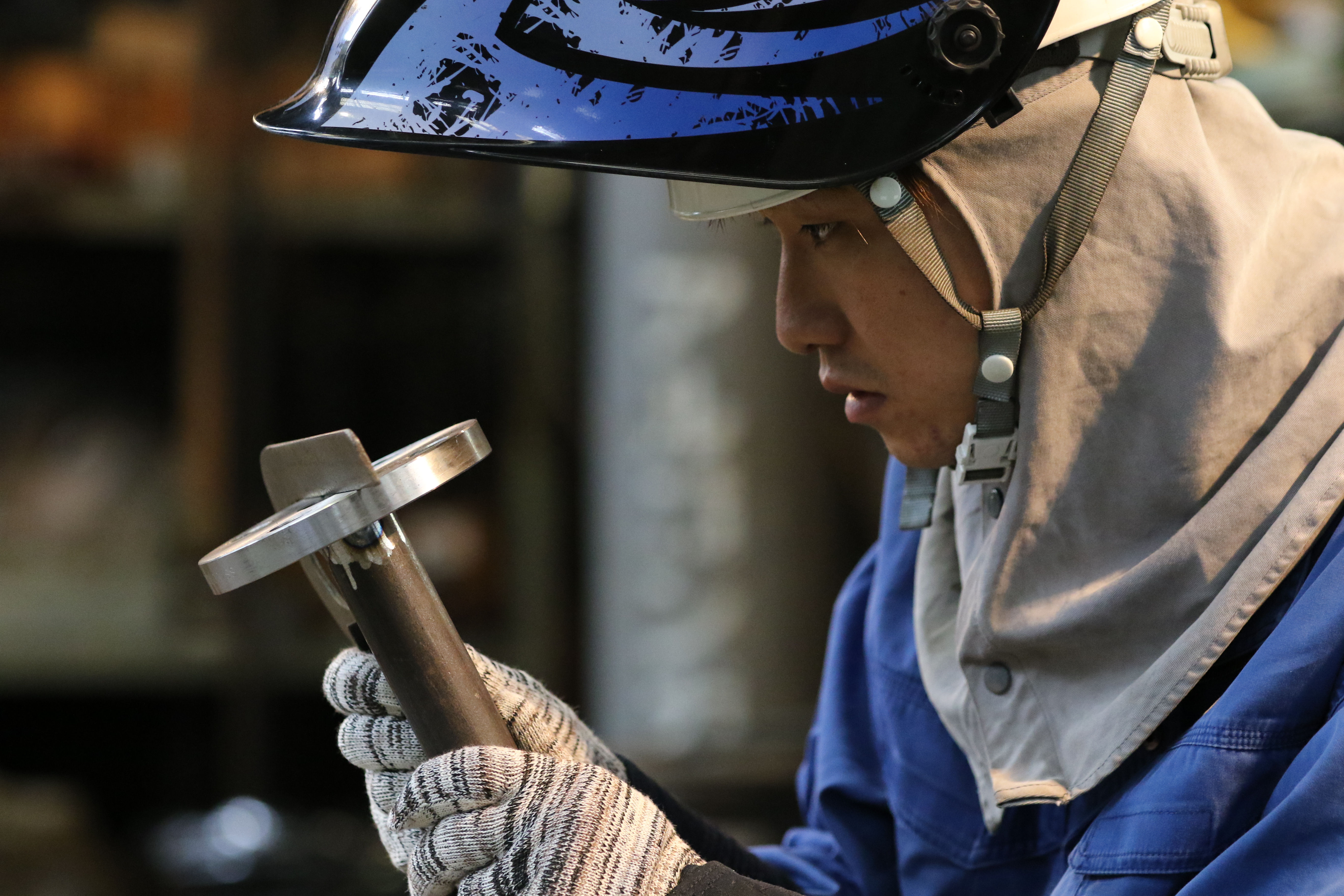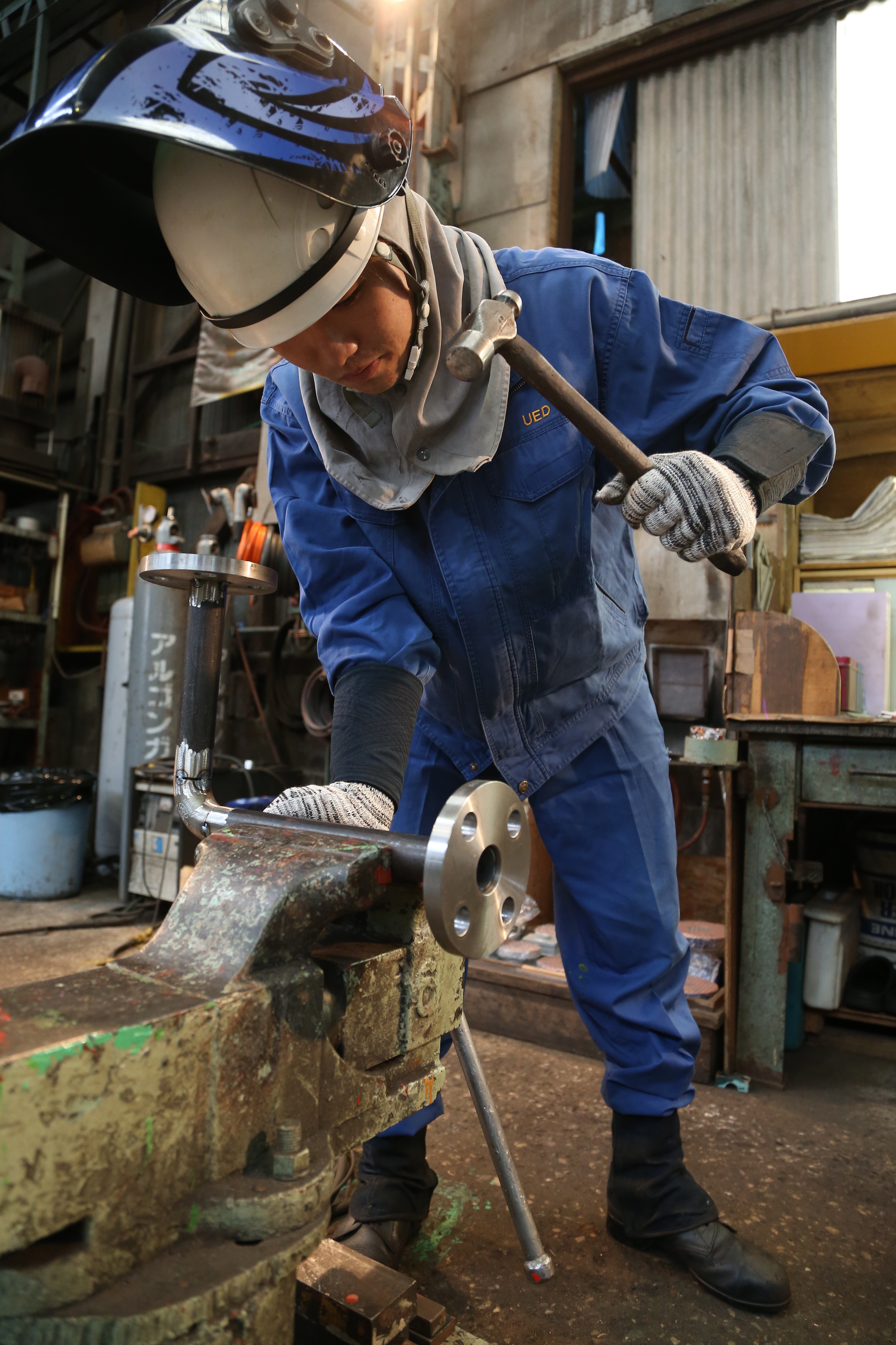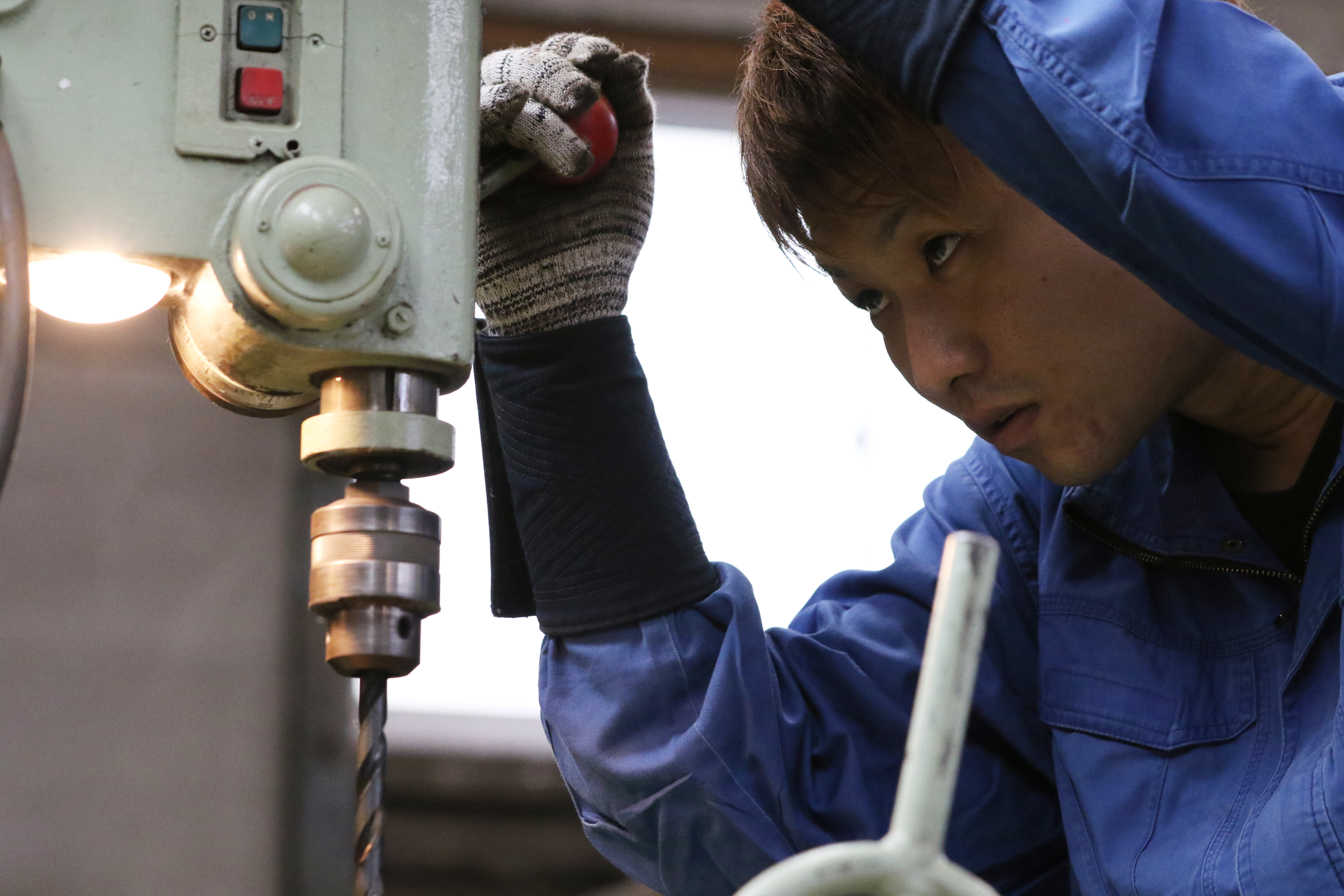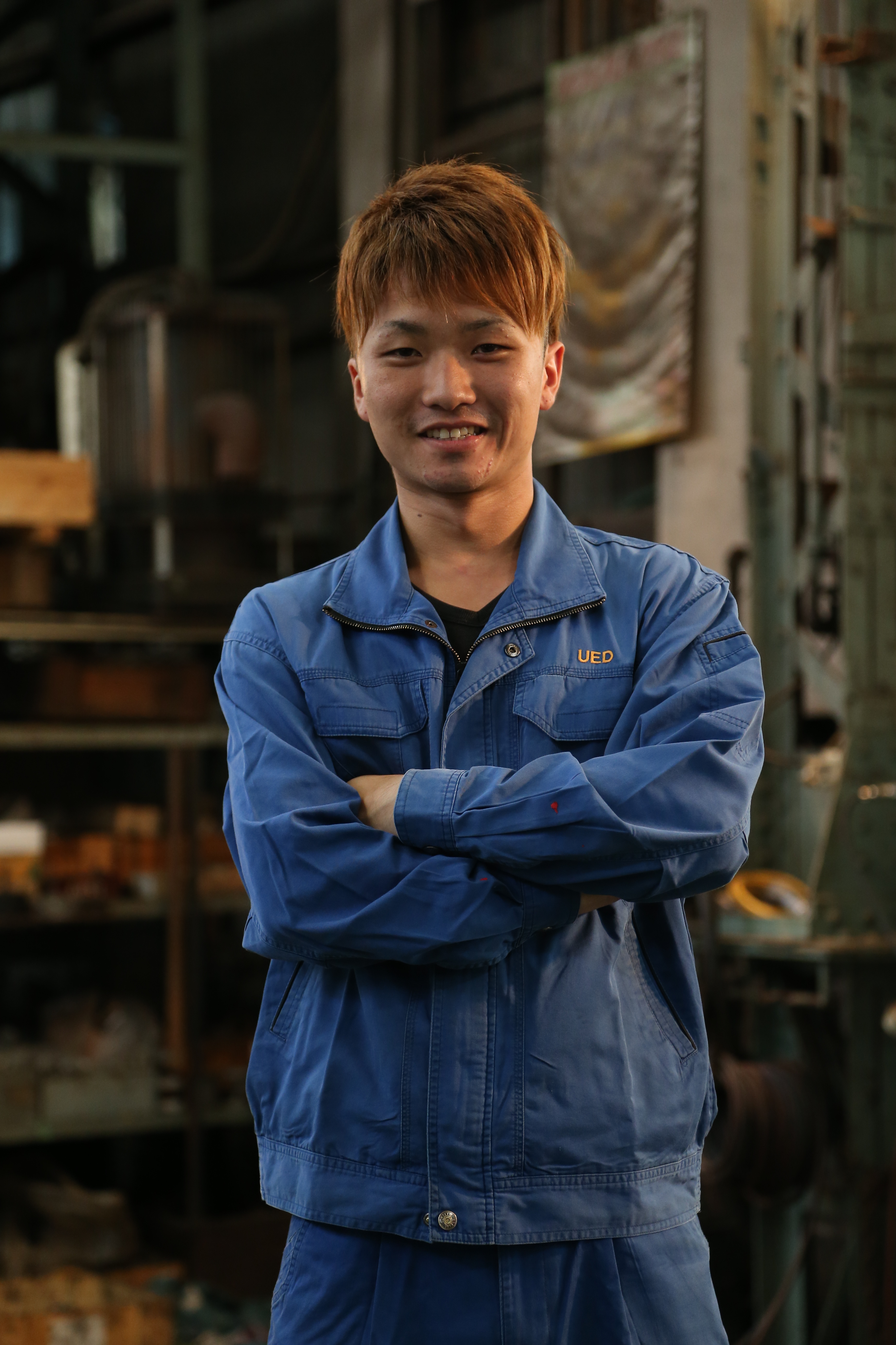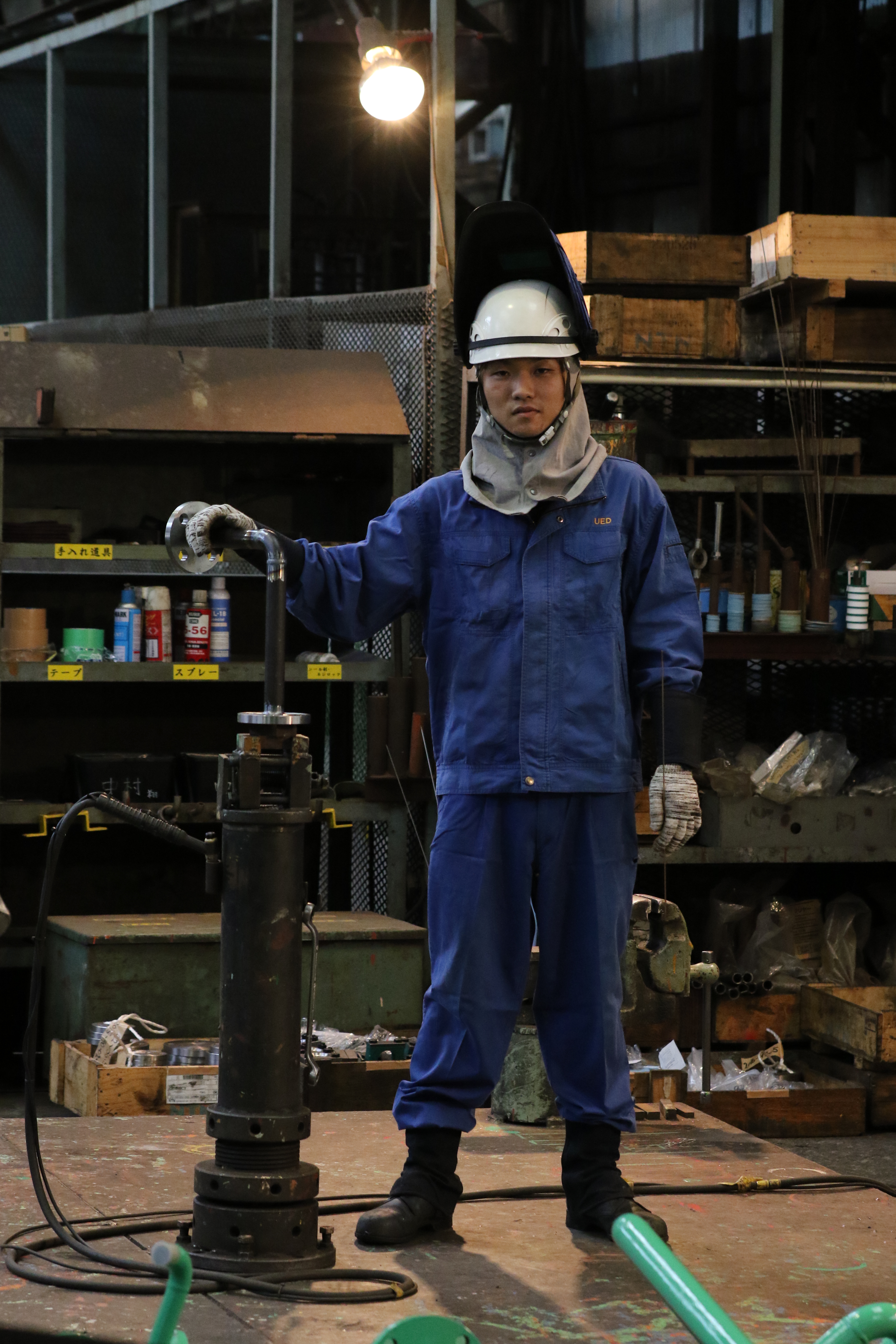 2016年10月31日 現在産業機械メーカーとして、独自技術を持つテンションリールやドラムなどの高性能リールメーカーでは、世界トップクラスの地位を築いている株式会社植田製作所。社内唯一の溶接技術者として汗を流す中村さんは入社3年目。若松高校普通科を卒業後、「家の近くで働きたい」という理由で入社。最初の1年は組立課に所属したが、溶接技術者の退職により、仕事覚えの早さと責任感を見込まれて後任に大抜擢。1年間におよぶ厳しい修行を経て、現在は溶接に関わる全ての業務を1人で担当している。「自分にしかできない仕事を任されている特別感がモチベーションになっています。入社前は仕事に夢を持てなかったけど、いまはこの会社に入って本当に良かった」。趣味はダーツで、大会にも出場する腕前。「休日は愛車で、彼女とドライブに行って気分転換しています」とニッコリ。