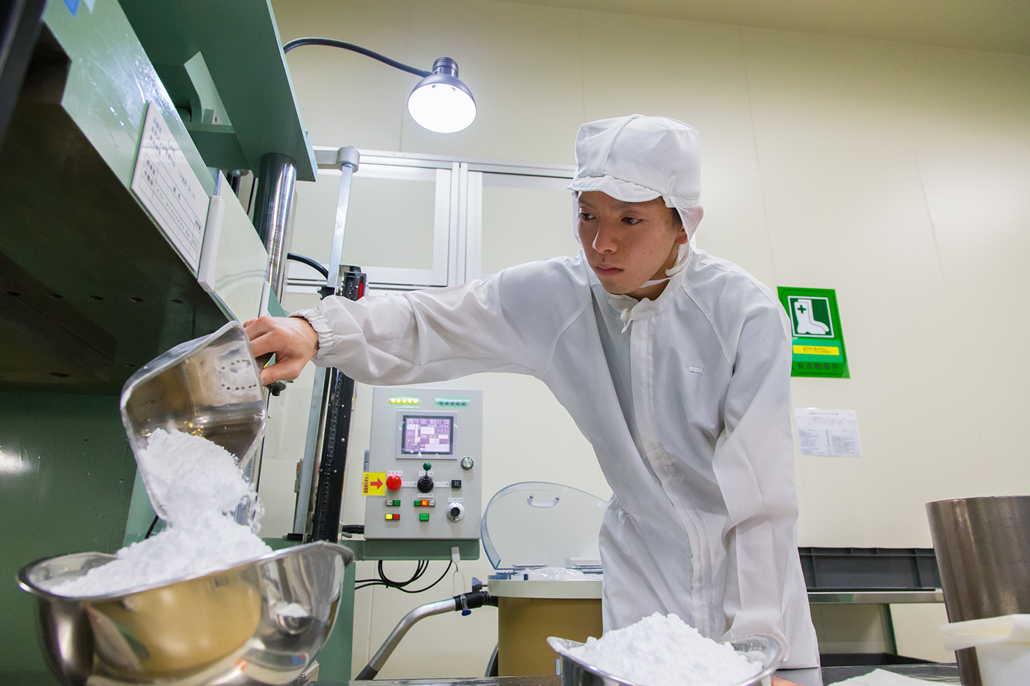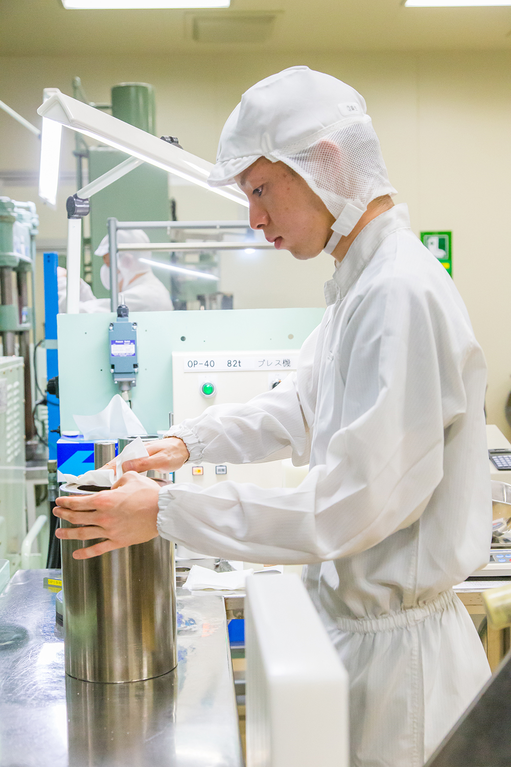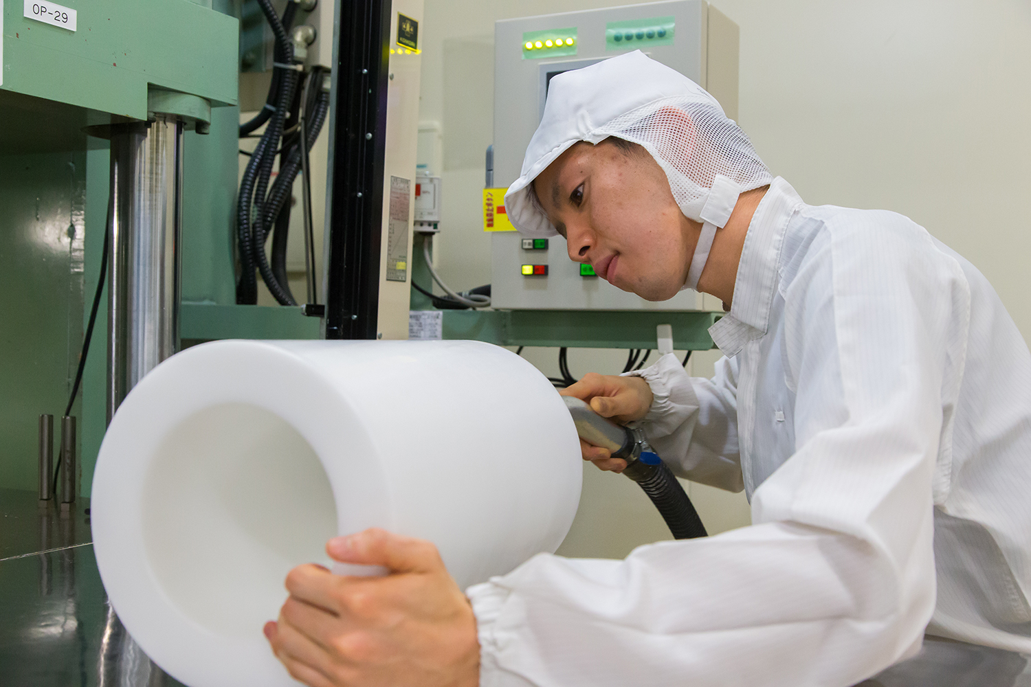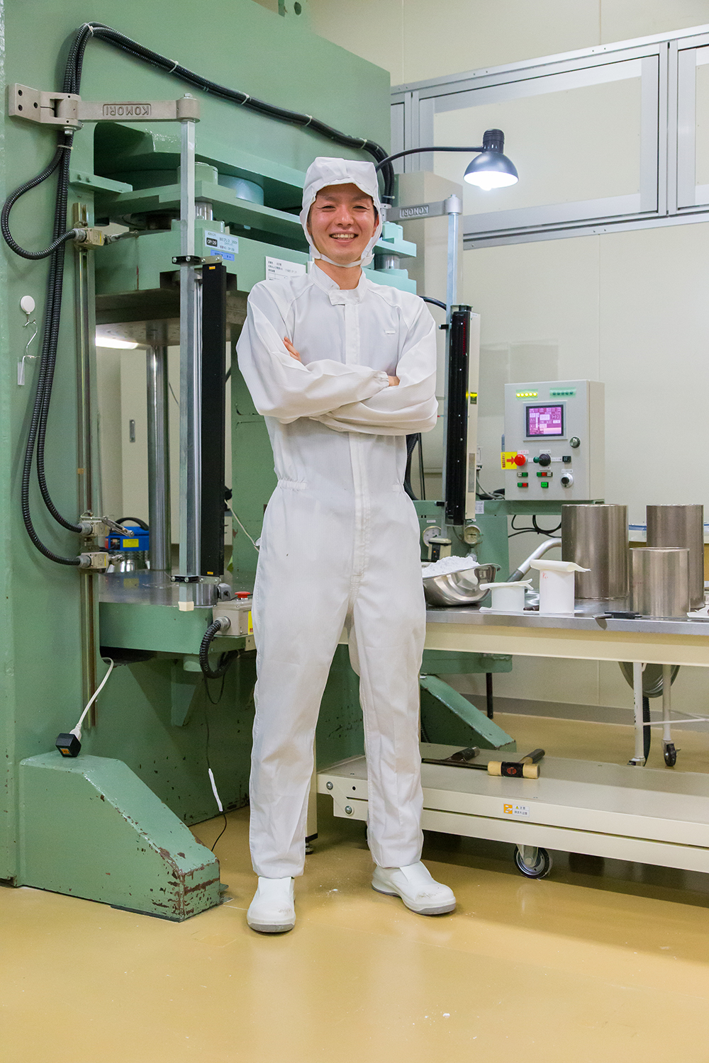 2016年3月31日 現在半導体製造や医療など、さまざまなシーンで使用される高機能フッ素樹脂部品の製造において、世界レベルの技術が評価されている株式会社陽和。麻生さんは入社2年目。大学では金属の加工を学んでいたため「柔らかく繊細なフッ素樹脂に、最初は戸惑いました」と苦笑い。現在は原料粉末を成形する工程に従事。工場内で一番大きな300トンプレス機を使い、真っ白いフッ素樹脂の塊を成形している。「求められた寸法できれいに出来上がると嬉しい。時間をかけて、このラインの技術を極めていきたい」。もともと、好きな車やバイクの部品を作りたくて、ものづくりに興味を持った。大型自動二輪免許を取得したばかりなので、目下の楽しみはバイクの購入。バレーボールやマラソンで汗を流す、体育会系でもある。